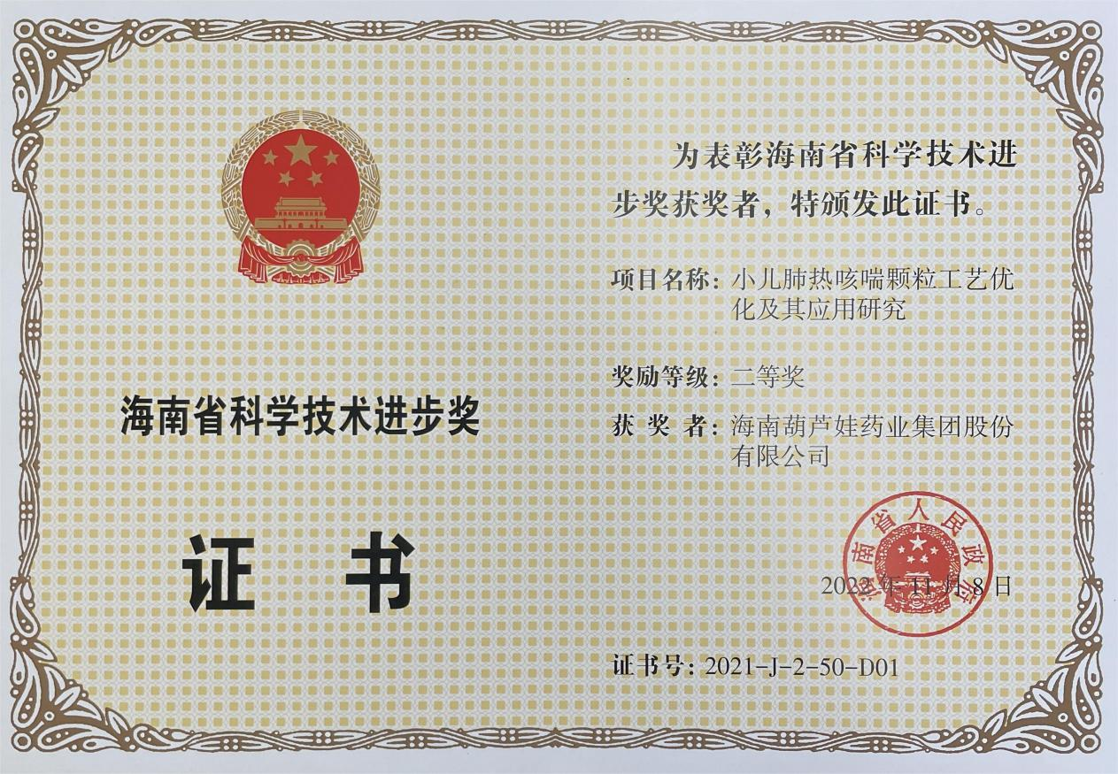 为此,小儿肺热咳喘颗粒的制备方法获得了第二十一届中国专利优秀奖(2019年),专利申请号:ZL201010134951,此次作为专利技术的应用,获得了2021年度海南省科学技术进步奖二等奖。在此之前,尊龙牌小儿肺热咳喘颗粒还多次被授予“临床价值中成药品牌”、“中国连锁药店最具合作价值单品”,荣登“中国医药品牌榜”。